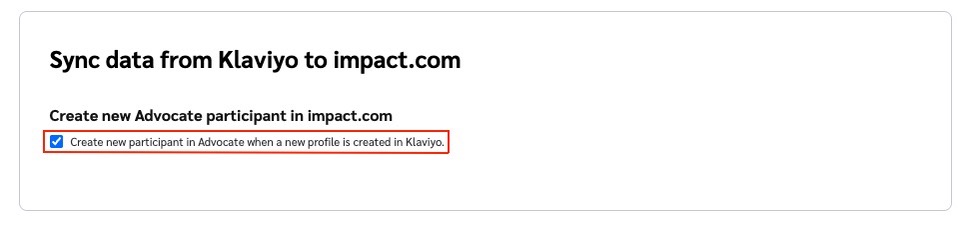 - Participant data syncing: Your Advocate program's participant details, referral stats, and rewards will be sent to Klaviyo automatically so that you can use these details for marketing decisions. Additionally, any new Klaviyo profiles will show up as Advocate program participants in impact.com.