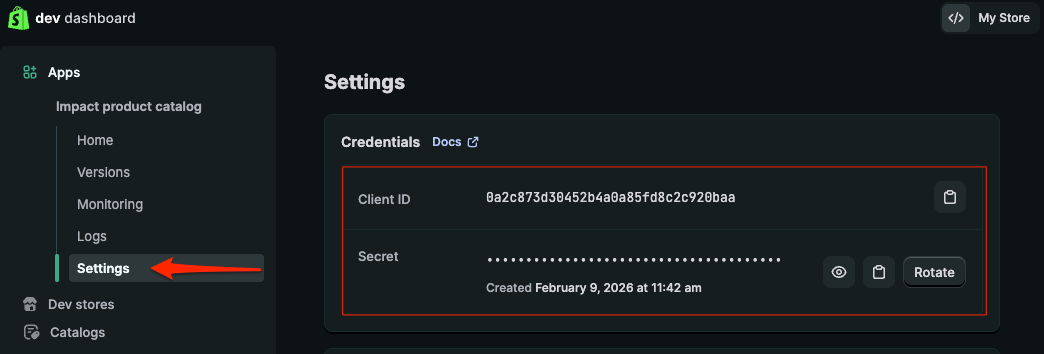Next, you'll create a custom app in your Shopify store. The purpose of this app is to generate secure credentials that you can plug into impact.com, authorizing us to access the catalogs in your store.